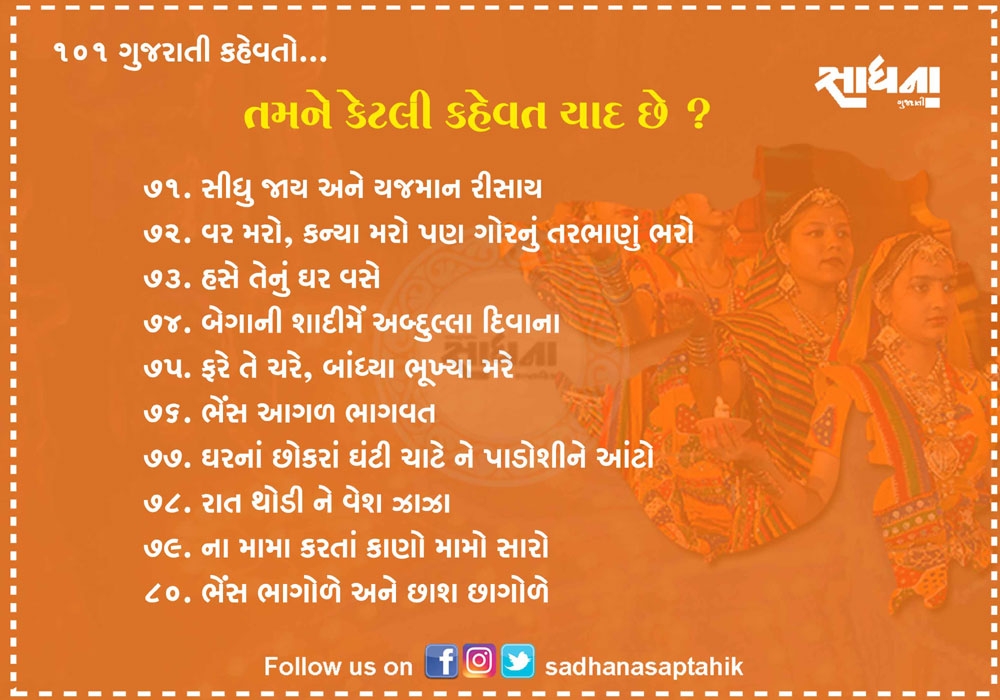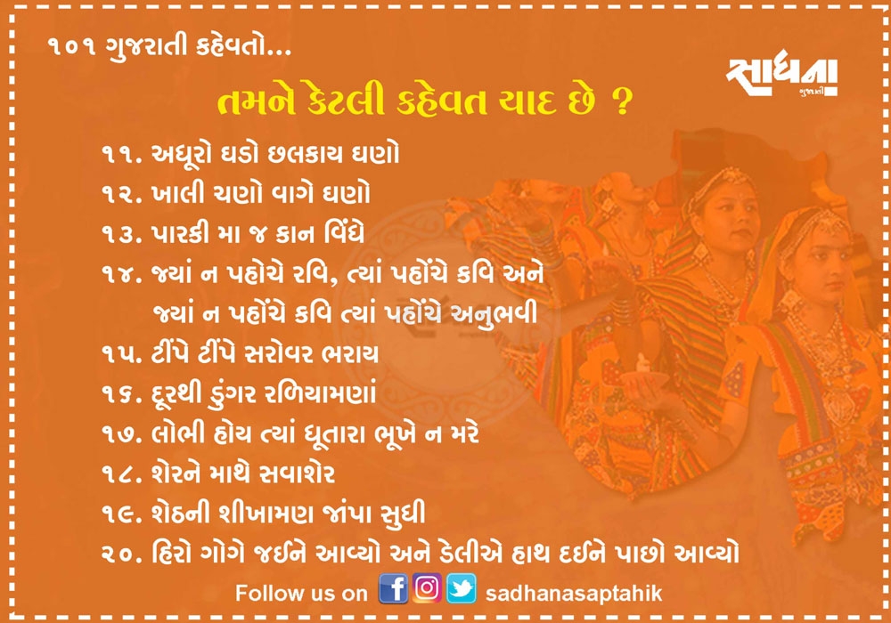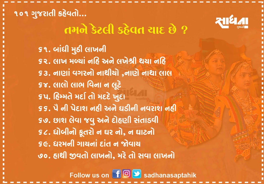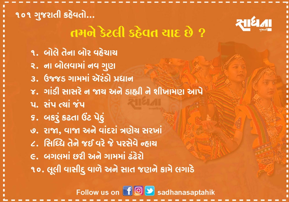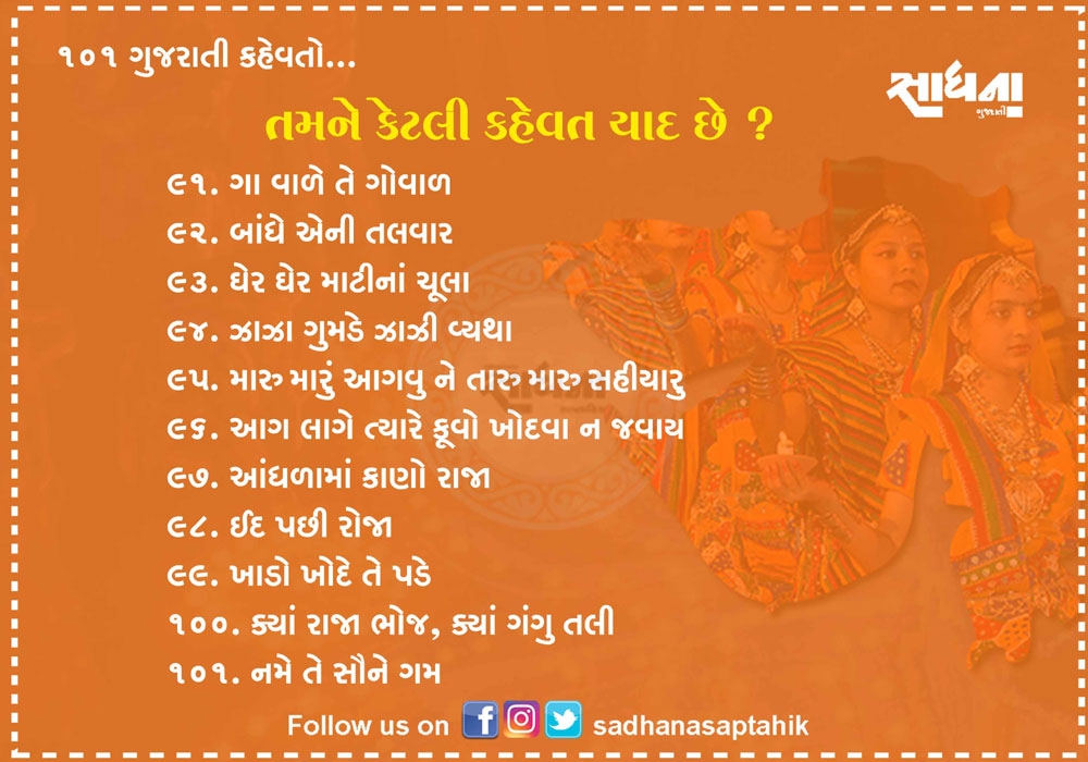 નિબંધ લખાય તેટલી મોટી વાતને માત્ર એક લીટીમાં લખવી હોય અને સામેવાળાને ખૂબ સરળતાથી સમજાવવી હોય તો તેના માટે કહેવત જ પૂરતી છે. ગુજરાતી ભાષા આવી અનેક કહેવતોથી સમૃદ્ધ ભાષા છે. પહેલાના જમાનામાં આપણી બોલીમાં આ કહેવત વારંવાર બોલાતી. એવું સમજો કે આપણી બોલીનો એક ભાગ હતો પણ હવે આ કહેવતો ભૂલાઈ ગઈ છે. આવા સમયે અહીં ૧૦૧ જેટલી સરળ અને બોલીમાં વાપરી શકાય તેવી કહેવતો રજૂ કરવામાં આવી છે....વાંચો તમને ગમશે.