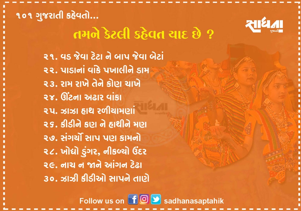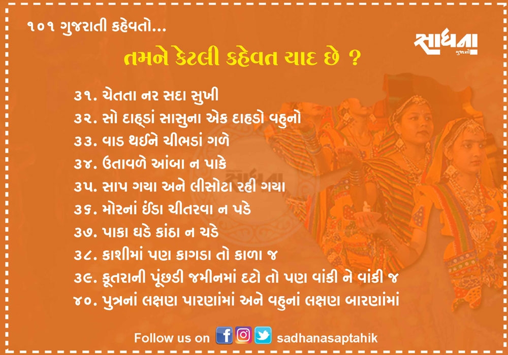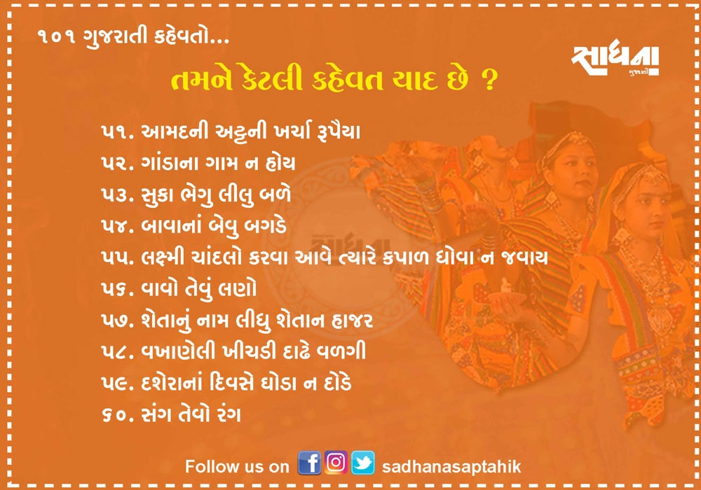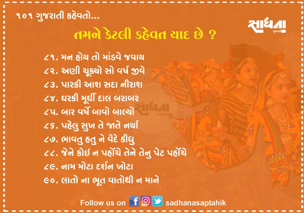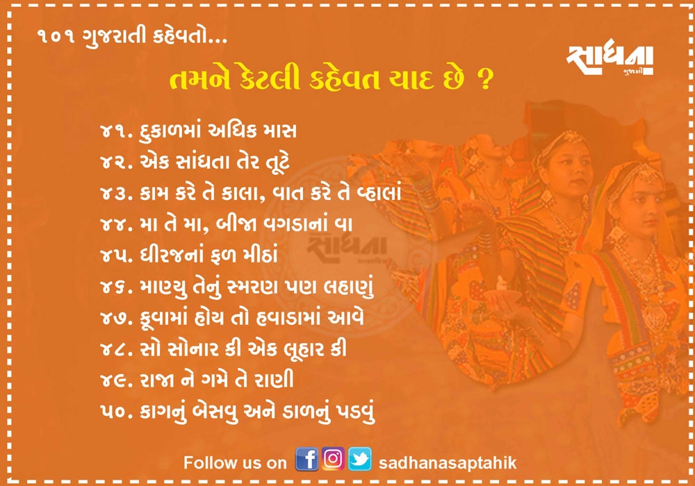 નિબંધ લખાય તેટલી મોટી વાતને માત્ર એક લીટીમાં લખવી હોય અને સામેવાળાને ખૂબ સરળતાથી સમજાવવી હોય તો તેના માટે કહેવત જ પૂરતી છે. ગુજરાતી ભાષા આવી અનેક કહેવતોથી સમૃદ્ધ ભાષા છે. પહેલાના જમાનામાં આપણી બોલીમાં આ કહેવત વારંવાર બોલાતી. એવું સમજો કે આપણી બોલીનો એક ભાગ હતો પણ હવે આ કહેવતો ભૂલાઈ ગઈ છે. આવા સમયે અહીં ૧૦૧ જેટલી સરળ અને બોલીમાં વાપરી શકાય તેવી કહેવતો રજૂ કરવામાં આવી છે....વાંચો તમને ગમશે.